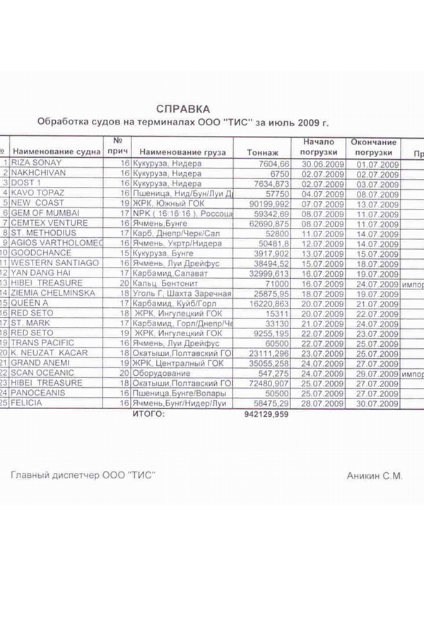 Но такое утверждение говорит лишь об истинном уровне компетенции Ю. Ю. Крука в области безопасности судоходства и вопиющем незнании оперативной обстановки в его собственном порту. Ведь именно 21 июля, когда администрация порта не пустила к причалу №21 «Scan Oceanic», все основные причалы ТИСа были заняты. Об этом свидетельствует «Справка обработки судов на терминалах ООО «ТИС» за июль 2009 г.»