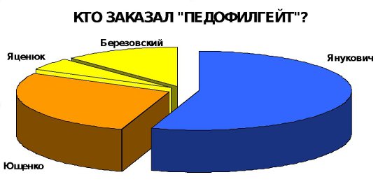 Интернет-опроса свидетельствуют, что заказчиком «Педофилгейта» выступила ОПГ (олигархично-политическая группа) в составе Виктора Януковича, Виктора Ющенко, Бориса Березовского и Арсения Яценюка.