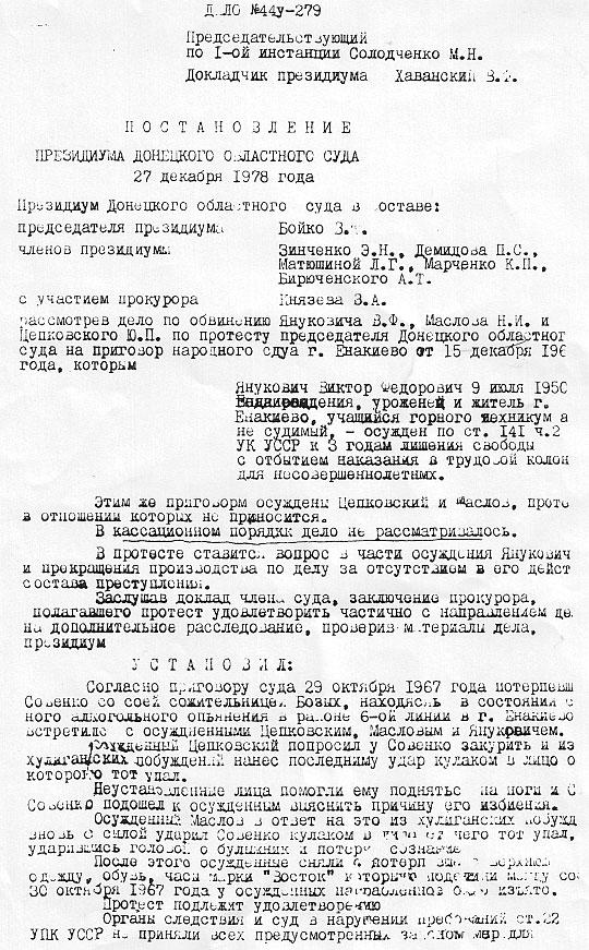 1. Постановление Президиума Донецкого областного суда. 27 декабря 1978 года