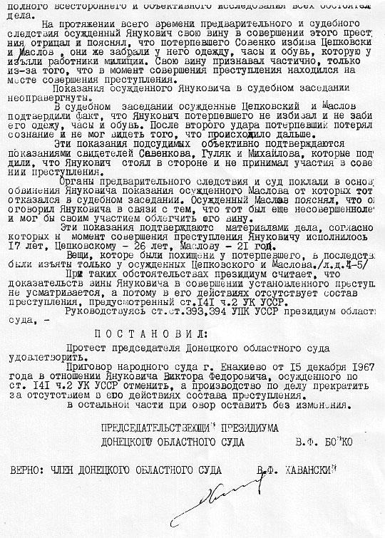 На основании этого суд удовлетворил протест председателя Донецкого областного суда, приговор Януковичу от 1967 года отменил, а производство по делу прекратил за отсутствием в его действиях состава преступления.