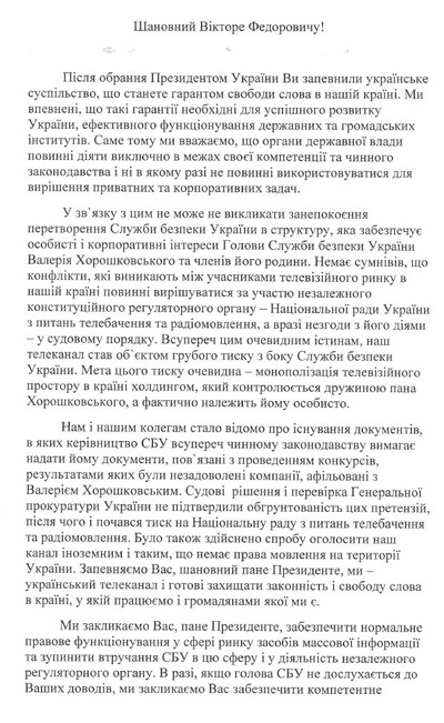 «Наш телеканал стал объектом грубого давления со стороны Службы безопасности Украины. Цель этого давления очевидна - монополизация телевизионного пространства в стране холдингом, который контролируется женой господина Хорошковского, а фактически принадлежит ему лично», - говорится в тексте обращения.