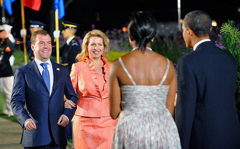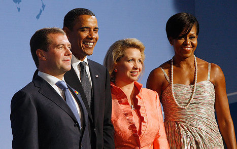 23 сентября 2009 года. Светлана Медведева и формальный глава Российского государства Дмитрий Медведев встречаются с семьей президента США Барака Хусейна Обамы. Её улыбка притворна. Своим положением она обязана не демократам, а республиканцам-неоконсерваторам