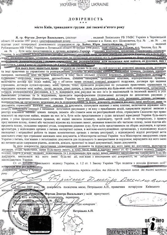 «Я, гражданин Фирташ Дмитрий Васильевич на основании устной предварительной договоренности уполномочиваю гражданина Бойко Юрия Анатольевича быть моим представителем в органах нотариата Украины, страховых компаний, кредитных (банковских) учреждениях Украины, их отделений, во всех органах регистрации прав, органах земельных ресурсов Украины... Для этого ему предоставляется право: составлять на условиях и по цене на свое усмотрение все разрешенные законом угоды, договора и другие правоотношения...»