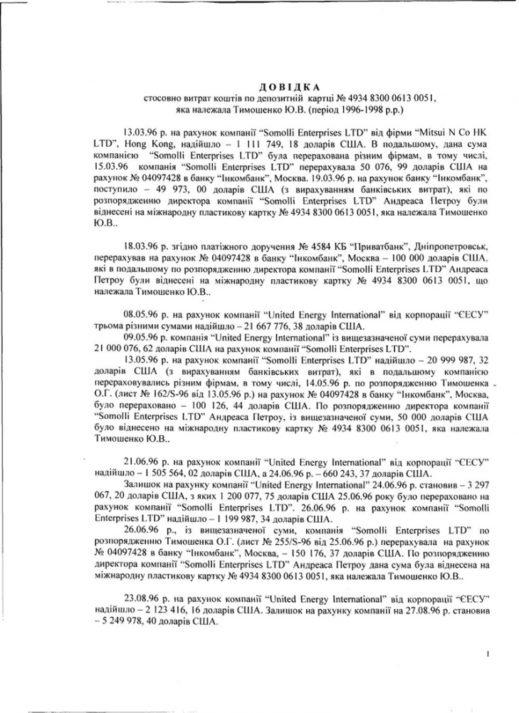 Тимошенко, следует напомнить, неоднократно снимала значительные суммы в банкоматах в Киеве, пользовалась своей «инкомбанковской» карточкой в различных европейских странах, США, Объединенных Арабских Эмиратах, Турции. Совокупная сумма расходов Тимошенко в 1996 – 1999 годах составила «всего-то» 908 тысяч долларов. Красиво жить не запретишь? Скажите, уважаемый читатель, Вы верите, что Юлия Владимировна тратила последнее? Она ведь покупала далеко не хлеб и молоко, а была клиенткой дорогих магазинов и роскошных ресторанов.