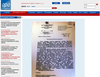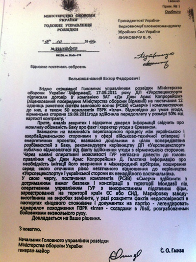 Крупный международный скандал разгорается между Украиной и Азербайджаном. Повод - торговля оружием. Вчера азербайджанское информагентство АРА выложило в открытый доступ якобы копию прошлогодней секретной докладной записки начальника Главного управления разведки Минобороны Украины генерал-майора Сергея Гмызы на имя президента и верховного главнокомандующего Вооруженных Сил Виктора Януковича (см. скриншот и скан документа).