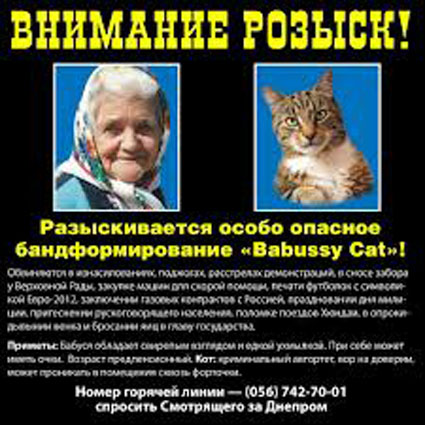 В Восточной Украине появился плакат с изображением бабушки и кошки, высмеивающий Партию регионов Януковича. «Узнала, что внук голосовал за регионалов, переписала хату на кота», - гласит плакат. Фотографии плаката стали хитом в Интернете, - сказано в материале The Wall Street Journal.