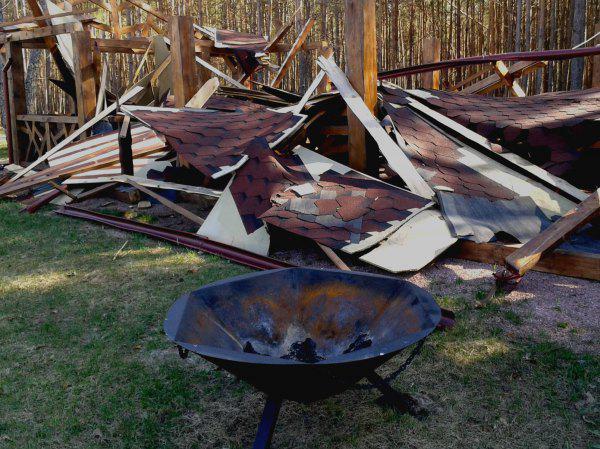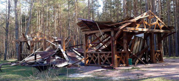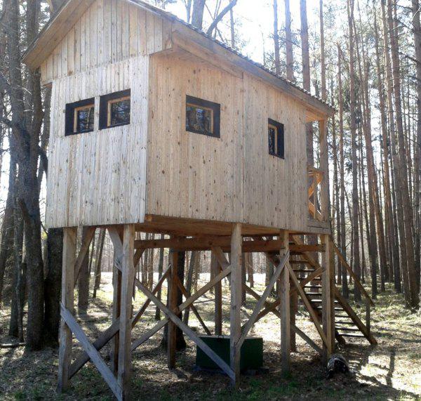 Местные говорят, именно из таких больших и безопасных домиков на сваях и охотится Виктор Янукович. Хотя трудно назвать охотой банальный расстрел доверчивых животных, которые в хозяйстве почти ручные. Далее объект, официально именуемый в охотничьем хозяйстве Януковича «беседка первой крови». Таких беседок в хозяйстве несколько. А это фото другой альтанки, но в данном случае заказчик вероятно «кинул» строителей, и те по-своему отомстили: сооружение было сделано халтурно - от зимних снегопадов крыша упала прямо на большой десятиметровый стол.