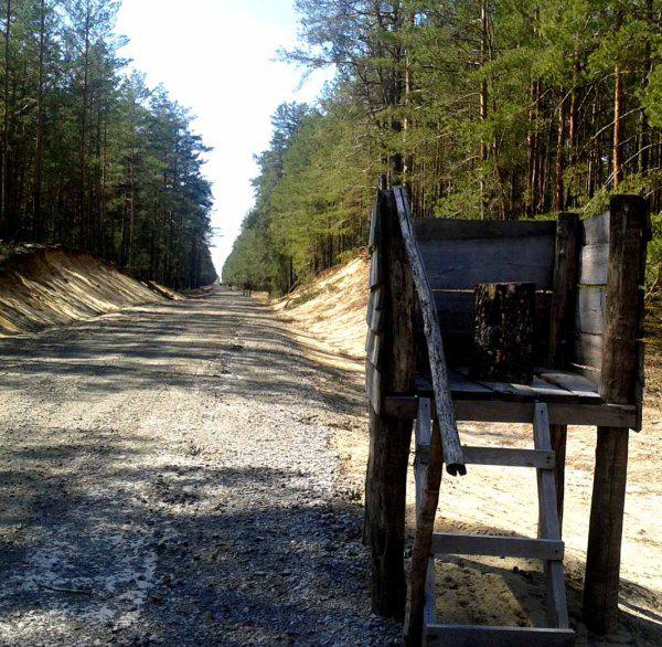 В лесу - широкая просека, посреди которой засыпана щебневая дорога. Причем эта дорога прямая, как стрела, и просматривается на километры в каждую сторону. И это на холмистой местности! Для достижения этого эффекта были подсыпаны болотца и срезаны холмы. И самое главное: везде на этой дороге через равные интервалы стоят деревянные вышки - номера для егерей.