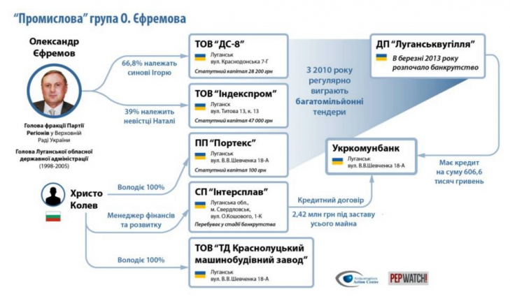 Укркоммунбанк играл ведущую роль в каждой схеме доведения до банкротства и дальнейшего присвоения активов государственных предприятий Луганщины за время пребывания Ефремова при власти.