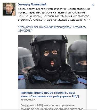 Именно Эдуард Лозовский недавно одобрительно прокомментировал вооруженную атаку милиции на митингующих Евромайдана, отметив, что следовало бы разогнать людей, «как Жуков в 1946 году разогнал бандитов в Одессе»:
