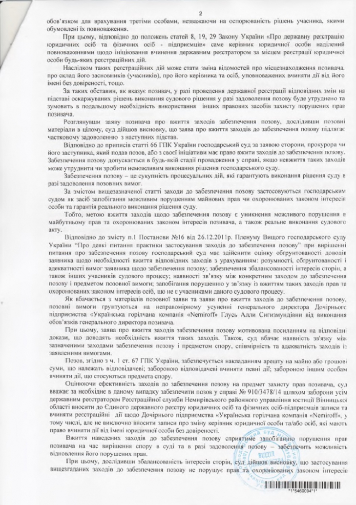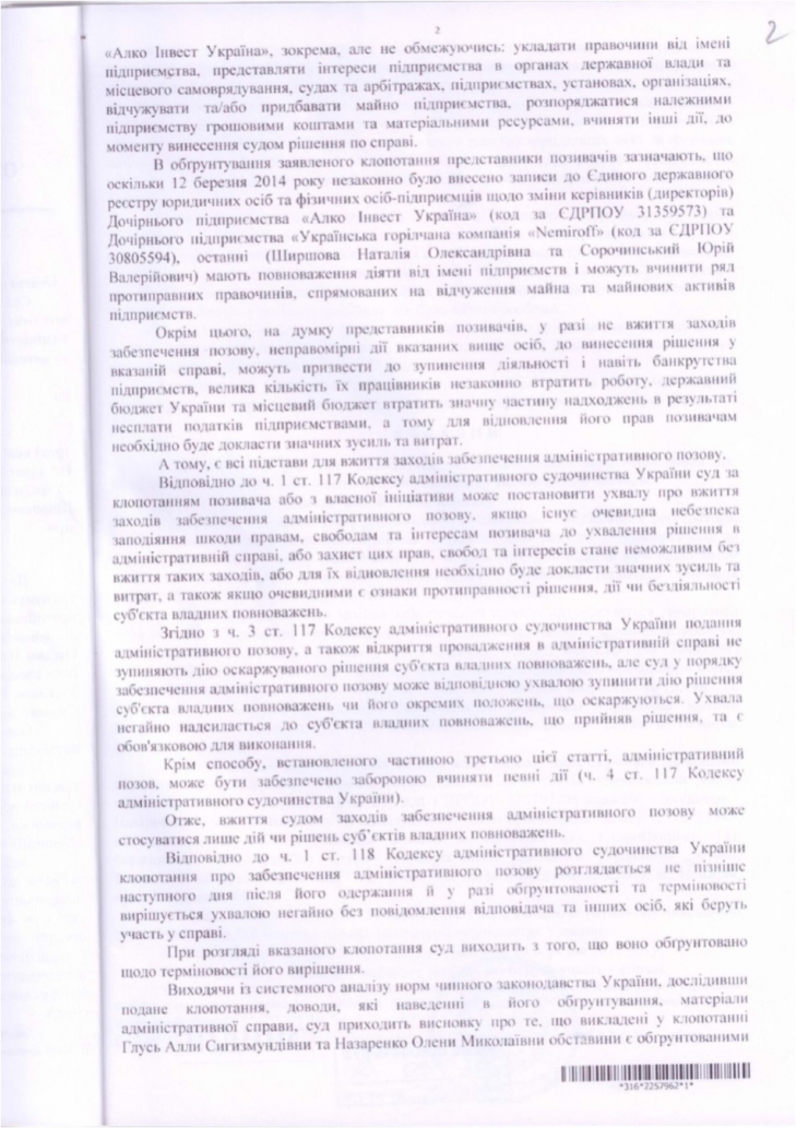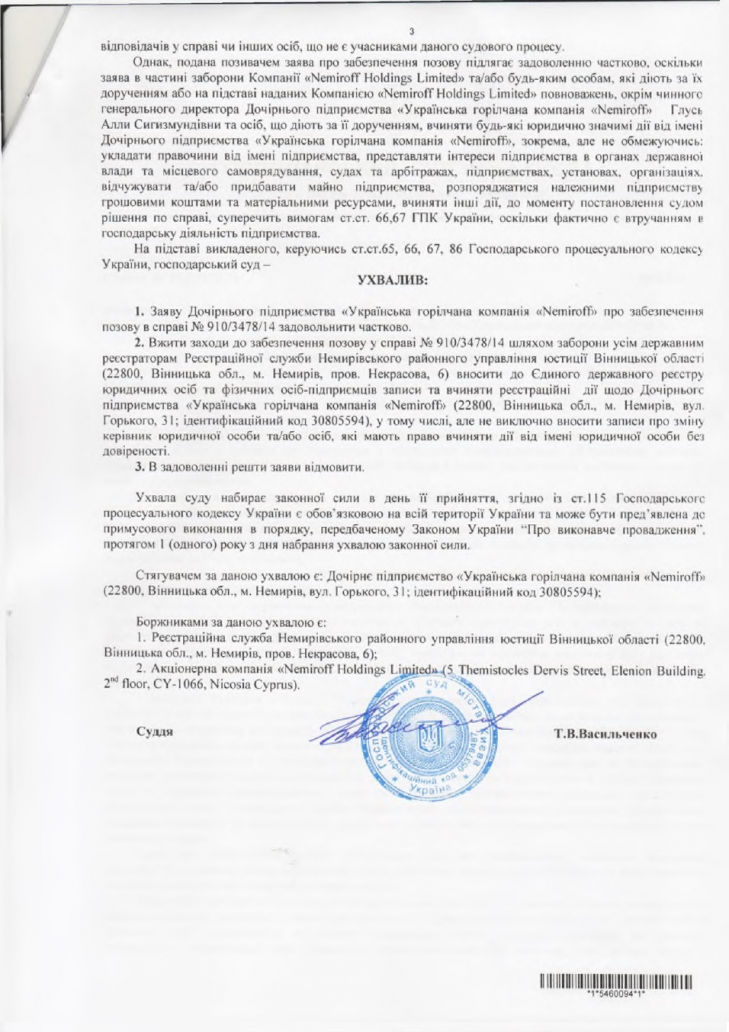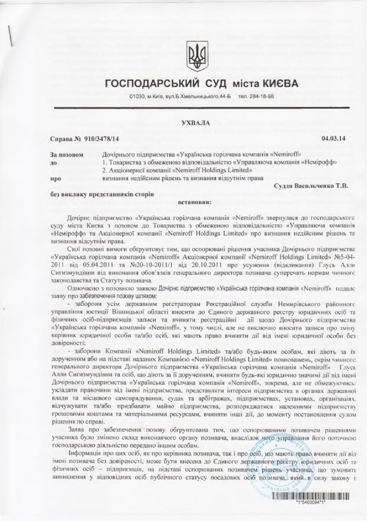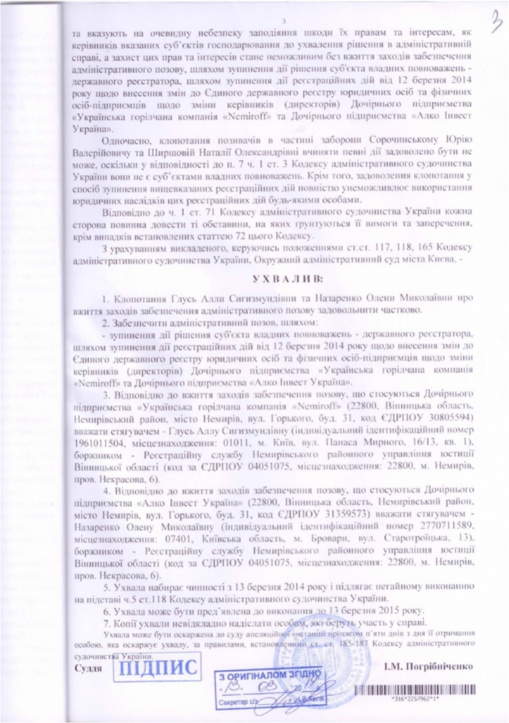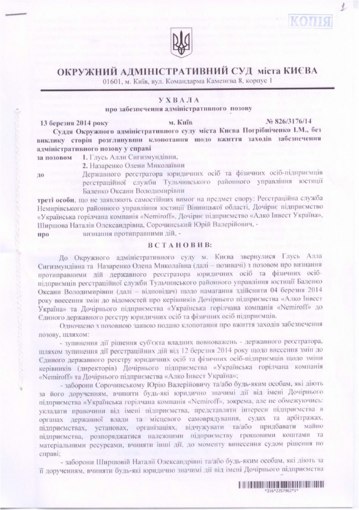 Вследствие его отказа был привезен из Винницы госрегистратор, который вместо информации о легитимном гендиректоре ДП «УВК «Nemiroff» Алле Глусь внес Сорочинского, представляющего интересы Анатолия Кипиша. Однако уже 13 марта 2014 г. Окружной административный суд г.Киева вынес Определение, остановившее регистрационные действия от 12 марта 2014 года. Таким образом, последние изменения записей, а также внесение карманных директоров в единый госреестр остановлены (копия Определения Окружного административного суда г.Киева от 13 марта 2014 г. прилагается).