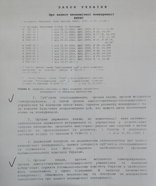 И для наглядности кабминовским делкам предоставили 2 выписки из украинских законов, которые под шумок хотели проигнорировать - «Закон Украины о защите экономической конкуренции» и Хозяйственный кодекс Украины. (см. принсткрин)