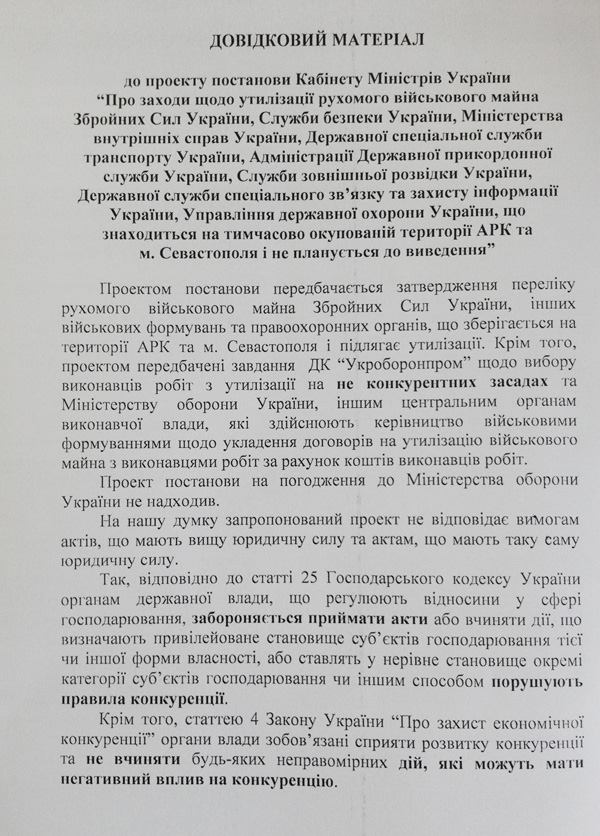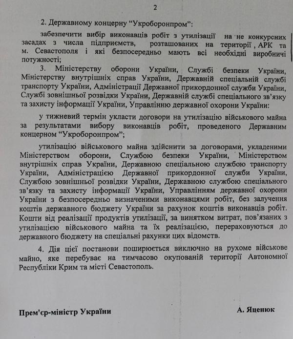 Государственному концерну «Укроборонпром» предписывалось единолично, на собственное усмотрение определить исполнителей работ по утилизации на «неконкурентных принципах» из числа тех предприятий, которые расположены в Крыму и имеют производственные мощности для проведения такого вида работ. В свою очередь, все указанные в Постановлении правительства ведомства должны были в авральном порядке заключить договора на утилизацию с «заведенными» в «Укроборонпром» предприятиями.