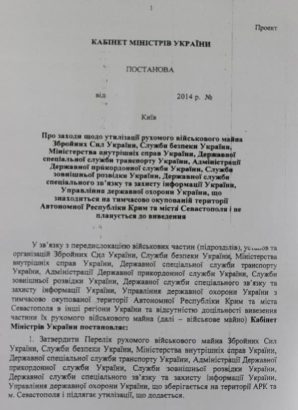 В недрах Кабинета Министров Украины родился проект постановления, «О мерах по утилизации движимого военного имущества Вооруженных Сил Украины, СБУ, МВД, Государственной службы транспорта, Администрации Государственной пограничной службы, СВР, Госслужбы специальной связи защиты информации, УДО, что находится на временно оккупированной территории АРК и не планируется к выводу».
