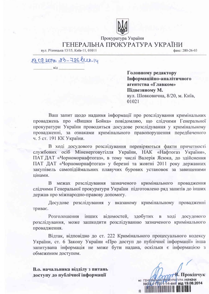 На один из предыдущих запросов «Главкому» в Генпрокуратуре также ответили, что экс-вице-премьер Украины и бывший глава министерства энергетики и угольной промышленности Украины Юрий Бойко проходит в скандальном деле по закупкам нефтегазовых вышек по завышенной цене лишь в качестве свидетеля.
