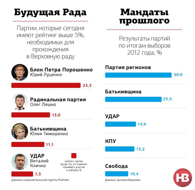 По июльским данным соцгруппы Рейтинг, с учетом всех опрошенных 5‑процентный проходной барьер преодолевают четыре партии: фигурирующая в этом опросе под старым названием Солидарность политсила Порошенко с рейтингом в 17,5 %, Радикальная партия Олега Ляшко (9,8 %), а также идущие следом Батькивщина Юлии Тимошенко, некогда взрастившая Ляшко, и УДАР Виталия Кличко. В итоге получится удивительная для украинской политистории конфигурация, в которой не нашлось места коммунистам и представителям финансовых групп Донбасса.