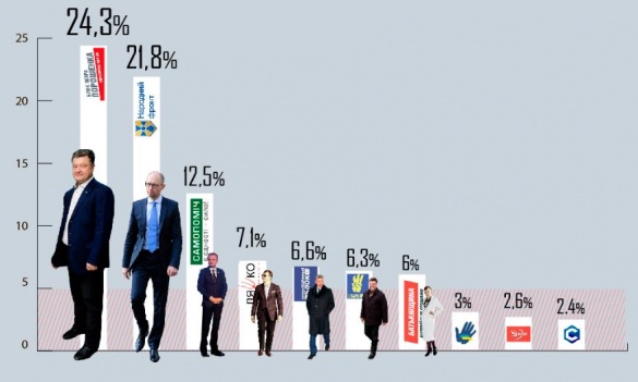 Пока не преодолевают пятипроцентный барьер ВО Свобода - у нее 4,66%. У Компартии - 3,92%, Гражданская позиция набирает - 3,20%, Сильная Украина - 3,12%, Заступ - 2,88%, Правый сектор - 1,86%. Остальные партии не набирают даже одного процента голосов избирателей.