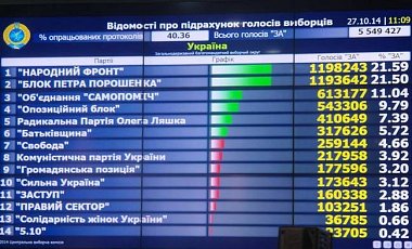 Народный фронт набирает 21,60%, Блок Петра Порошенко - 21,50%, Самопоміч - 10,90%, Оппозиционный блок - 9,77%, Радикальная партия - 7,47%, ВО Батькивщина - 5,77%, Свобода - 4,64%, КПУ - 3,91%, Гражданская позиция - 3,16%, Сильная Украина - 3,10%, Заступ - 2,96%, Правый сектор - 1,84%.