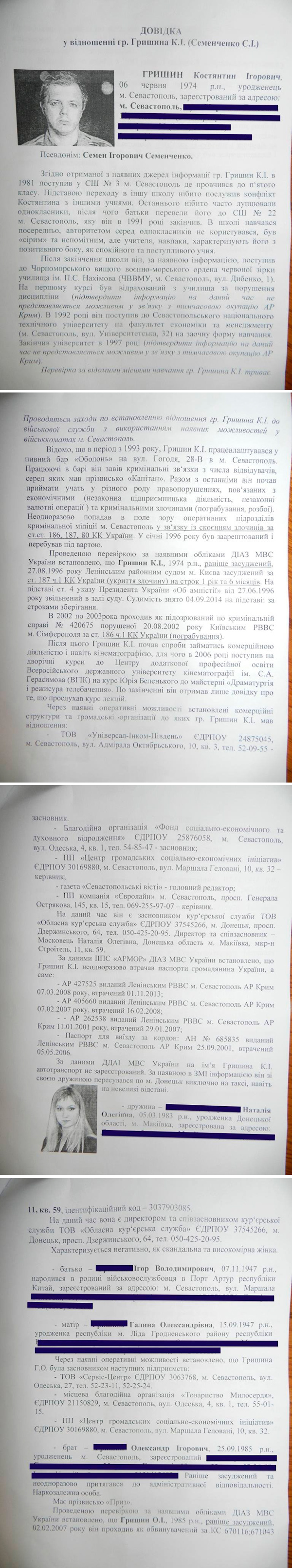 В частности, в опубликованной биографической справке рассказывалось, что бывший командир добровольческого батальона «Донбасс», созданного при поддержке администрации Днепропетровской области, возглавляемой миллиардером Игорем Коломойским, на самом деле является ранее судимым уроженцем Севастополя Константином Гришиным по кличке «Капитан», обладающим давними связями в преступном мире. Кроме того, были сообщены подробные данные о родных Семенченко-Гришина (в частности, говорилось о егобрате-наркомане, также имевшим проблемы с законом), включая их бизнес-интересы и особенности характера.