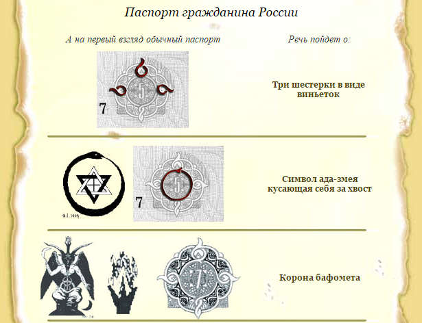 Следует в связи с этим отметить, что в паспорте гражданина Российской Федерации при желании можно увидеть не менее мистические «сатанинские» рисунки.