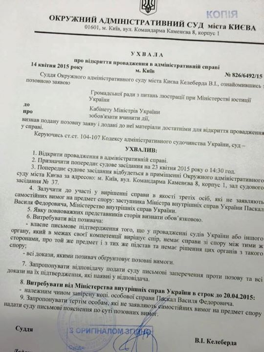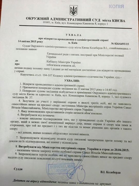 В то же время журналист Дмитрий Гнап обнародовал постановления Окружного админсуда Киева о двух высокопоставленных милиционеров: Сакала и Паскала. 22 апреля суд должен начать рассматривать их отстранение с должностей по люстрации.