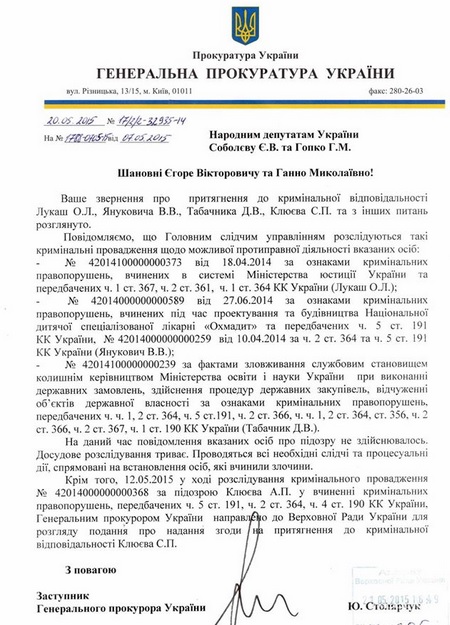 «Две недели назад мы обратились к Виктору Шокину с вопросом, почему до сих пор не объявлены подозрения о преступлениях Сергею Клюеву Дмитрию Табачнику и Елене Лукаш. В письме мы дали понять, что знаем и ответ – чтобы Европейский Союз снял с них введенные 15 месяцев назад санкции, поскольку украинские правоохранительные органы за это время не удосужились хотя бы объявить им подозрение, не говоря о доведении до передачи в суд дел о масштабном мародерстве», - пишет нардеп.