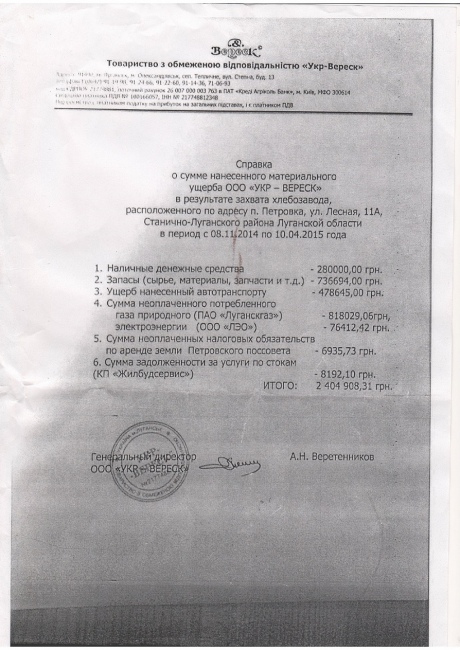 Москаль отмечает, что в ноябре 2014 года военные заняли один из самых больших хлебозаводов на контролируемой Украиной территории Луганской области – ООО «УКР-ВЕРЕСК» в с. Петровка, что возле Станицы Луганской.
