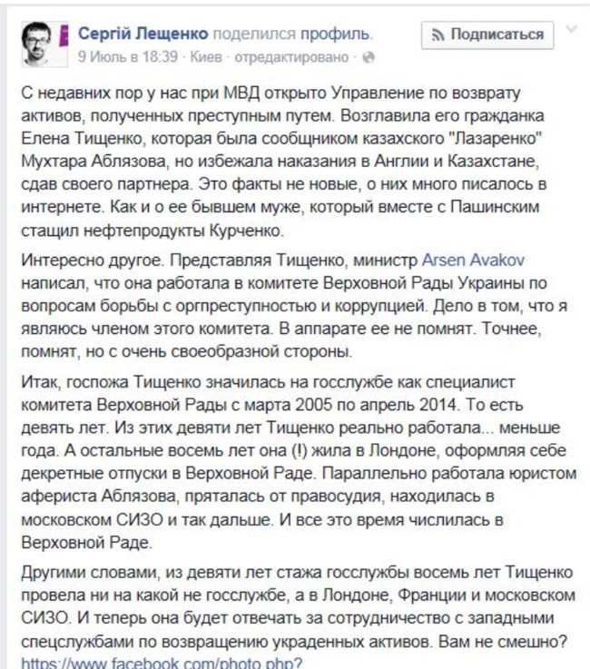 «Г-жа Тищенко значилась на госслужбе как специалист комитета Верховной Рады с марта 2005 по апрель 2014 года. То есть девять лет. Из этих девяти лет Тищенко реально работала... меньше года. А остальные восемь лет она жила в Лондоне, оформляя себе декретные отпуска в Верховной Раде», – добавил он. То есть, по словам депутата, из девяти лет стажа госслужбы восемь лет Елена Тищенко «провела ни на какой не госслужбе». «И теперь она будет отвечать за сотрудничество с западными спецслужбами по возвращению украденных активов. Вам не смешно?», – написал Лещенко.