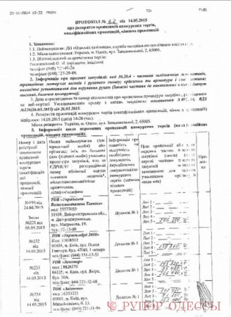 Предложения поступили от ПАО «Одесский машиностроительный завод «Красная гвардия»: сумма предложения — 165 048 грн.; ООО «Промэкспосервис» из Днепродзержинска (сумма предложения — 164 200 грн.,); ООО «Будмашпром» из того же Днепродзержинска (сумма предложения — 168 360 грн.). Разница в предложениях незначительная (у ПАО «ОМЗ «Красная гвардия» и ООО «Промэкспосервиса» всего в 800 грн.).