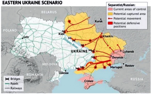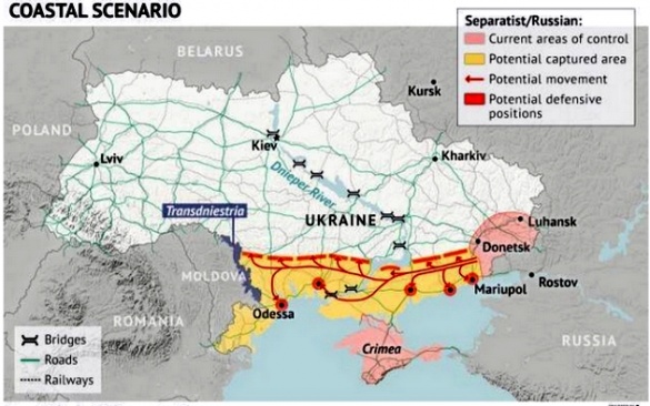 Сценарий 2: захват всего юга Украины Сценарий заключается в соединении по южному побережью Черного моря захваченных территорий Донбасса с Крымом и дальнейшей оккупацией на запад от перешейка - вплоть до Приднестровья. Украина полностью отрезается от моря. Для операции понадобится около 40-60 тысяч личного состава атакующих войск, и еще 80-120 тысяч - для удержания территории. При таком сценарии интервенты продвинутся в Украину на 645 км и захватят около 104 тыс. кв. км земли.