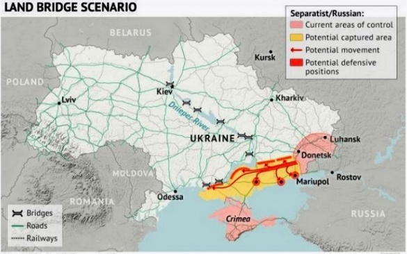 Сценарий 1: сухопутный коридор Реализация этого сценария заключается в соединении оккупированного Крыма и районов Донбасса. Агрессору нужно будет продвинуться более чем на 400 км вглубь Украины и контролировать около 46,6 тысяч кв. км территории с населением примерно два миллиона человек. При таком развитии событий ударные силы РФ будут стараться быстро продвинуться в направлении Херсона и Новой Каховки, где впоследствии создадут мощные укрепрайоны. Возникнет более 450 км новых оборонительных линий.