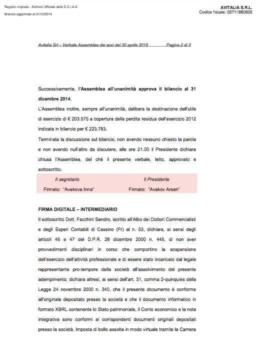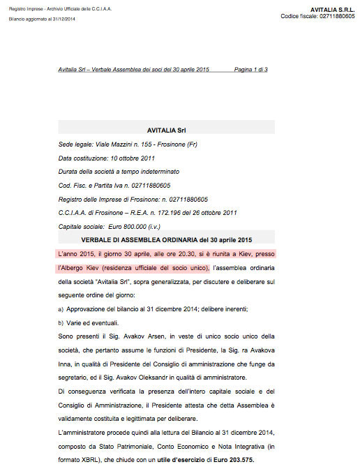 Лещенко приводит имеющийся у него в распоряжении протокол о собрании акционеров данной фирмы, состоявшемся 30 апреля 2015 в гостинице «Киев» в присутствии Арсена Авакова и его жены Инны Аваковой. На собрании акционеров был утвержден отчет за 2014 год и распределена прибыль в размере 203 тысячи евро. Протокол собрания акционеров подписан президентом компании AvItalia SRL Арсеном Аваковым.