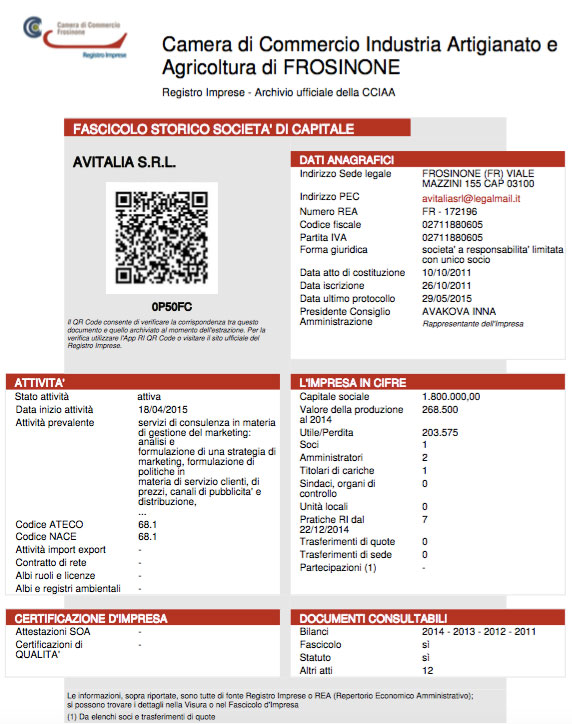 «В торгово-промышленной палате итальянской провинции Фрозиноне мной получено регистрационные документы по предприятию AvItalia SRL. Согласно уставным документам, фирма была основана в 2011 году с целью управления недвижимостью», - отметил Лещенко.