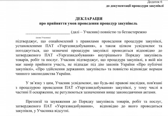 При этом они «кладут с прибором» на действующее законодательство и фактически ставят свыше его свои внутренние ведомственные документы, которые сами же и составляют. Причем, каждого участника тендеров заставляют подписывать Декларацию «Про прийняття умов проведення процедур закупівель», где должен подписать согласие играть по навязанным правилам Биляги с Федоренко, а не по законам Украины: «підтверджую, що ознайомлений з правилами проведення процедури закупівлі, установленими ПАТ «Укргазвидобування», а також цілком усвідомлює та погоджується, що зазначені процедури закупівлі проводяться відповідно до затвердженого ПАТ «Укргазвидобування» внутрішнього Порядку закупівель товарів, робіт та послуг».