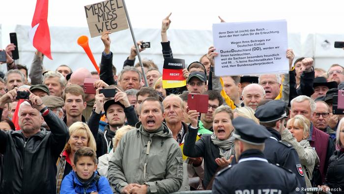 Ангела Меркель по прибытии в Дрезден подверглась нападкам со стороны демонстрантов. Сторонники правопопулистских движений называли канцлера "изменницей Родины" и требовали ее отставки.