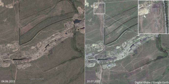"4 июня 2015 года на площади не видно никаких признаков (техники). 20 июля 2015-го следы, указывающие на интенсивное использование и наличие военной техники в новосозданных лагерях уже заметны. Уже в июле 2015 года на объекте были заметны танки и гаубицы", - отмечают расследователи.