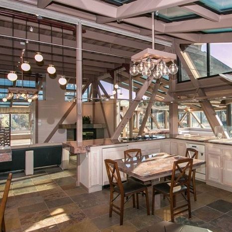 Доступ в дом осуществляется за счет гидравлического лифта. На жилой площади 578 квадратных метров обустроено три спальни, четыре ванные комнаты, гостиная со столовой, кухня и подсобные помещения. Из окон открывается потрясающий вид на природный ландшафт.