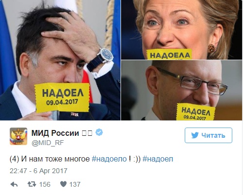 6 марта к флешмобу присоединился МИД России. В официальных аккаунтах министерства в Твиттере и Фейсбуке появились посты с хештегом надоело. "И нам тоже многое #надоело!:))", - сказано в сообщении российского МИДа. К одному из постов прикреплены фотографии надоевших российскому министерству политиков - Михаила Саакашвили, Арсения Яценюка и Хиллари Клинтон.