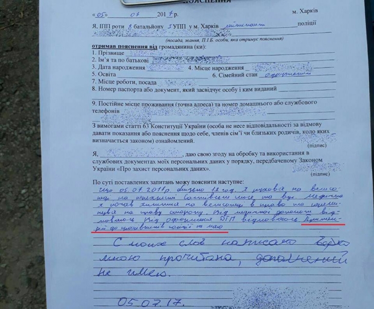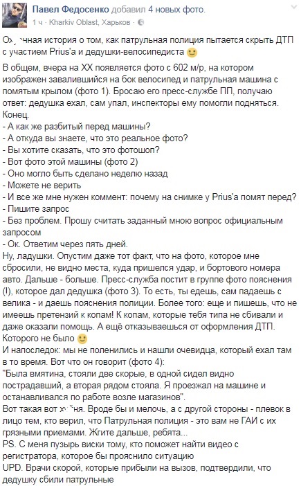 "То есть, ты едешь, сам падаешь с велика - и даешь пояснения полиции. Более того: еще и пишешь, что не имеешь претензий к копам! К копам, которые тебя типа не сбивали и даже оказали помощь. А еще отказываешься от оформления ДТП. Которого не было", - отметил Федосенко.