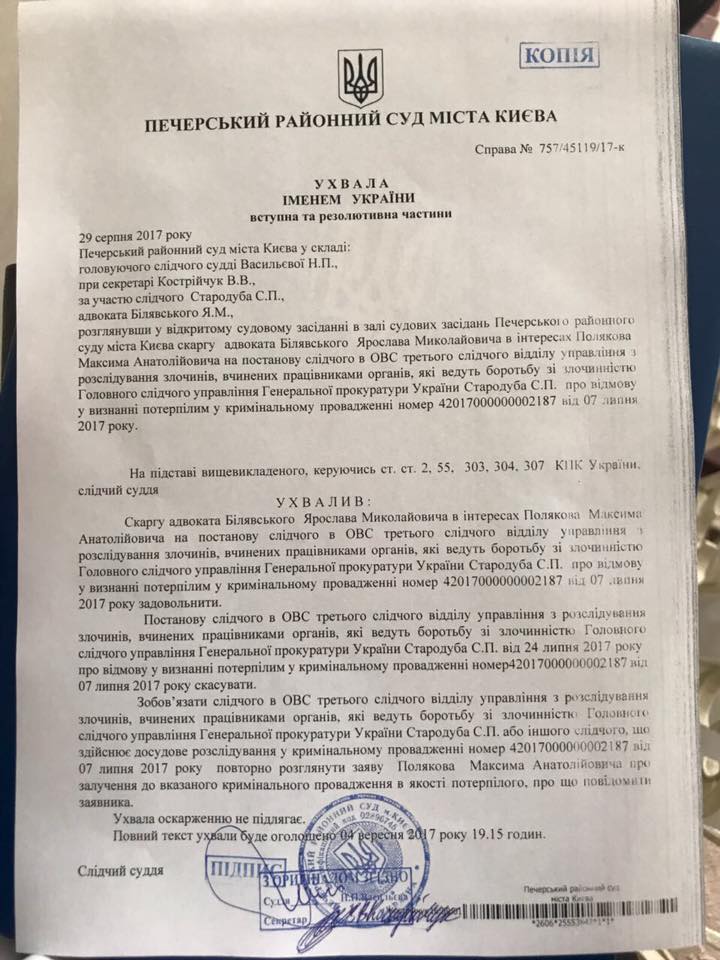 "У відповідь на поширення «спростувальної» інформації Печерського суду про невизнання мене потерпілим у провадженні щодо провокації підкупу НАБУ, викладаю короткий текст вчорашньої ухвали слідчого судді, якою скасовано постанову слідчого про відмову у визнанні потерпілим.