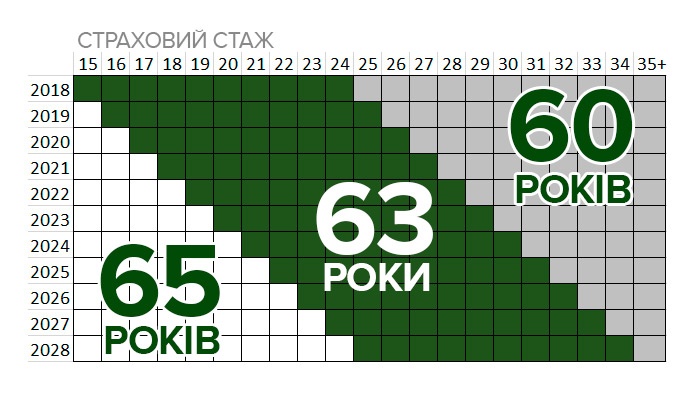 Так, если реформа таки будет принята в нынешнем виде, со следующего года выйти на пенсию в 60 лет можно будет, имея страховой стаж 25 лет (сейчас минимальный стаж 15 лет). Порог страхового стажа будет постепенно подниматься и до 2028 года достигнет 35 лет.