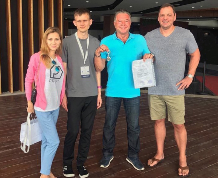 2017 год, Мексика. Все участники первой в мире продажи недвижимости за криптовалюту с использованием полного цикла технологии блокчейн и смартконтракта: Наталья Караянева (глава агентства Propy, подготовившего сделку), Виталий Бутерин (основатель второй по популярности криптовалюты в мире Еthereum, за которую была продана киевская квартира), продавец Марк Гинзбург и покупатель Майкл Аррингтон. Фото: из личного архива Марка Гинзбурга
