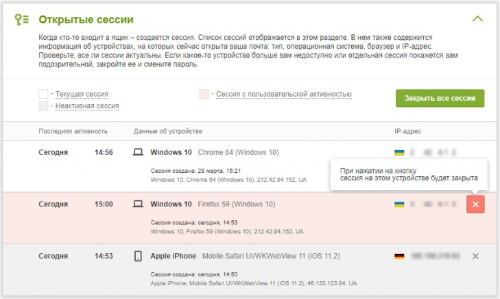 В Настройках безопасности самого популярного украинского почтового сервиса @UKR.NET появился раздел «Открытые сессии». Он показывает устройства, у которых есть доступ к почтовому ящику, а также позволяет закрыть ненужный сеанс.