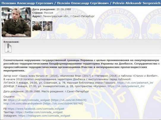 В комментарии к информации говорится, что Пелевина внесли в базу «Миротворца» за «сознательное нарушение государственной границы Украины и участие в антиукраинских пропагандистских мероприятиях».
