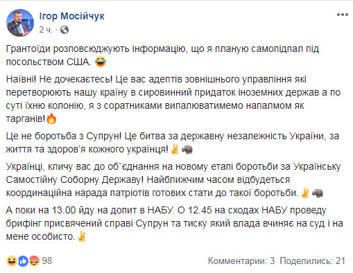 Однако с самосожжением, видимо, все оказалось не так просто. Через несколько часов Мосийчук стер свой комментарий и написал на своей странице в «Фейсбуке» гневный пост о том, что ничего такого не говорил: