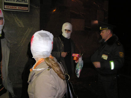 Сотрудники милиции задержали четверых участников акции, облаченных в костюмы мумий, а также журналиста Ярослава Стешика, который снимал происходящее на фотокамеру. По свидетельству Стешика, милиционеры заявили, что молодые люди в костюмах мумий похожи на преступников, которые якобы находятся в розыске. Журналисту, в свою очередь, заявили, что он не имеет права вести фотосъемку и также похож на фоторобот преступника.