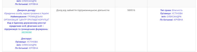 В своей декларации за 2017 год Александра Устинова указала получение денег от «Центра противодействия коррупции» как предприниматель (ФОП).