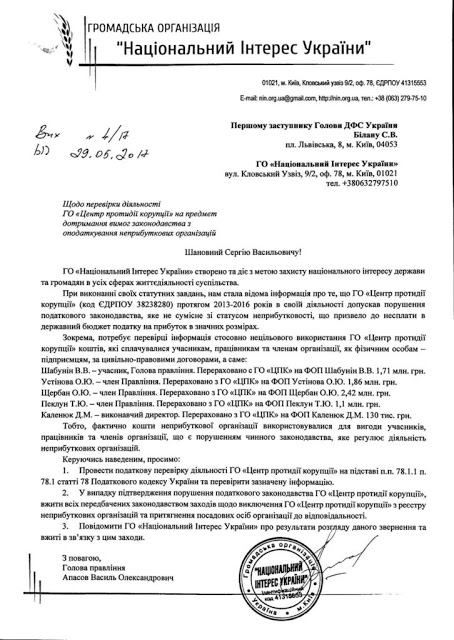 В мае 2017 года ОО «Национальный интерес Украины» написали заявление на имя тогдашнего Главы ГФС Украины Билана С.В. в котором изложили известную нам информацию, что в период с 2013 по 2016 год, ОО «Центр противодействия коррупции» в своей деятельности (борьба с коррупцией) нарушали налоговое законодательство Украины, которое не совместимо со статусом неприбыльной организации. Что повлекло за собой уклонение от уплаты налогов в государственный бюджет в значительных размерах.