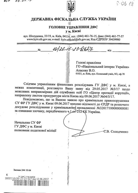 В июле 2017 года Главное управления ГФС в г. Киеве по заявлению ОО «Национальный интерес Украины» о криминальном правонарушении внесло ведомости в ЕРДР и начало досудебное расследование.