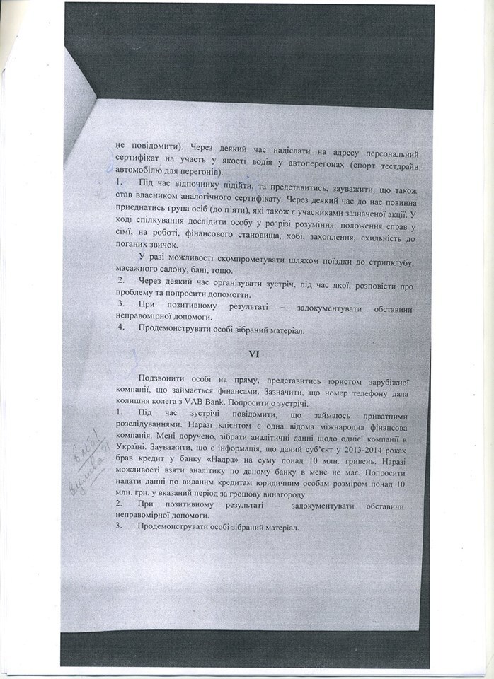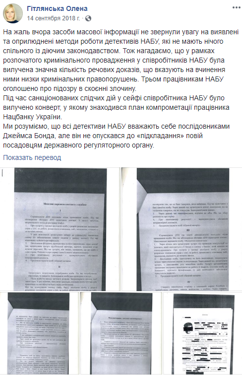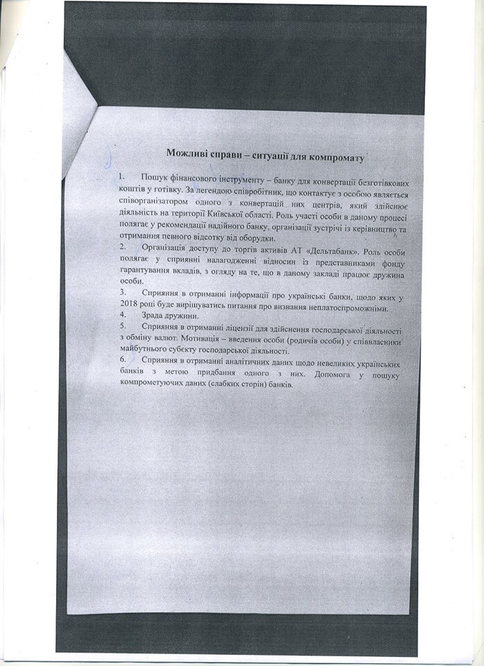 "В сейфе одного из сотрудников НАБУ был изъят конверт, в котором находился план компрометации сотрудника НБУ. Согласно нему, представители НАБУ должны были создать условия для знакомства с указанным должностным лицом путем искусственного создания ДТП с его участием и дальнейшим приглашением в заведение общественного питания для употребления алкогольных напитков якобы для урегулирования вопросов возмещения ущерба, нанесенного во время ДТП. После употребления алкоголя сотрудниками НАБУ планировалось спровоцировать сотрудника НБУ к вступлению в интимные отношения с заранее избранным лицом и осуществить видеофиксацию внебрачных половых связей", - заявили тогда в СБУ.